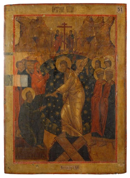 Источниками иконографии служили апокрифическое Евангелие Никодима, богослужебные тексты, псалмы и пророчества Ветхого Завета, Послания апостола Петра, святоотеческие сочинения. Среди последних особенно важны „Слова о сошествии Иисуса Христа во ад“ Епифания Кипрского и Евсевия Александрийского. В них рассказывается о том, как Христос после Своей смерти сошел в преисподнюю, поверг Сатану, ценой жизни спас праведников, смыв Своей кровью первородный грех Адама и Евы. О сошествии Христа во ад поется в Акафистах Христу и Богоматери. Иисус Христос. СПб, 2000. С. 327.