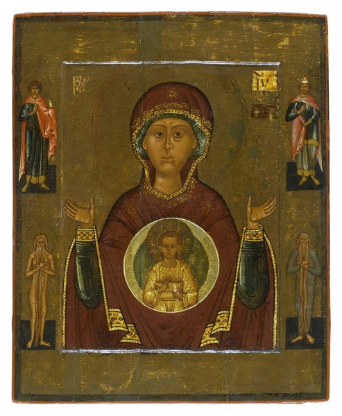 Написана как «истинное изображение и мера» прославленной новгородской иконы «Богоматерь Знамение», явившей чудо избавления города от нашествия «сопротивных» в 1170 г. На полях иконы — четыре фигуры палеосных святых — Георгий, Иаков Перский, Онуфрий и Макарий Египетский. Именно такой состав изображений на полях обязательно присутствует на иконах новгородского извода и отличает их от многочисленных списков с других чудотворных икон «Богородицы Знамение» (например, «Абалацкой», где на полях изображались Николай Чудотворец и Мария Магдалина, или «Знаменской» иконы московского Златоустовского монастыря, на полях которой помещались образы Николая и Иоанна Новгородского).