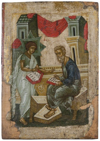 Царские врата, фрагментом которых является клеймо-спилок, относятся к редкому иконо- графическому варианту с женскими образами, диктующими евангелистам текст Евангелия и олицетворяющими Премудрость. Надпись на восьмиугольном нимбе вокруг головы ангела: «Премудрость Божия Iсъ Хсва». Персонификации Ангела Премудрости заимствованы из книжной миниатюры XV века. Древлехранилище памятников иконописи и церковной старины в Русском музее. СПб, 2014. С. 78.