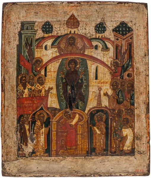 На Руси в 60-х гг. XII в. при владимирском князе Андрее Боголюбском был установлен специальный праздник Покрова, отмечавшийся 1 октября и отразивший константинопольский культ ризы Богоматери. С ним связывались идеи покровительства, заступничества Святой Девы за человеческий род и всю Русскую землю. Существует несколько иконографических вариантов этого сюжета.  Ирина Шалина // «Пречистому образу Твоему поклоняемся...». Образ Богоматери в произведениях из собрания Русского музея. СПб. 1995. С. 133.