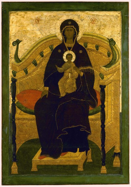 Образ "Богоматери на престоле" восходит к искусству VI в. Самый ранний памятник – фреска в нише алтаря капеллы монастыря Аполлона в Бауите (Египет, VI – VII вв.). На египетской фреске Богоматерь держит перед собой овальный медальон с изображением восседающего на престоле и благословляющего Спаса Эммануила. Позднее этот тип распространился в византийских алтарных росписях XI–XII вв. и в иконописи. В византийской иконографии тип "Богоматери на престоле", облаченной в вишневый мафорий и темный хитон, стал именоваться Панахранта (греч. – пренепорочная). На Руси изображение Богоматери на престоле было широко распространено в качестве центрального образа пророческого чина иконостаса с XVI в.