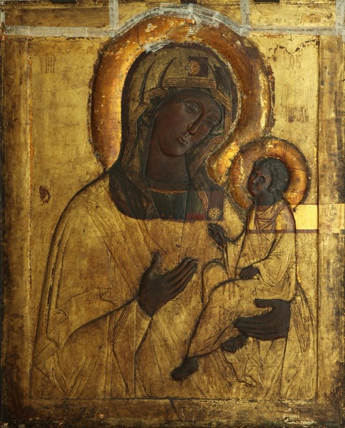 Образ «Богоматери Тихвинской» (память 26 июня / 9 июля) имеет древнюю историю. «Богоматерь Тихвинская» — один из вариантов «Богоматери Одигитрии». Иконография образа сложилась в византийском искусстве. Отличительной чертой этого типа является своеобразное положение скрещенных ножек Спасителя, при котором одна, правая, подвернута так, что видна ее обнаженная подошва. Первоначально икона находилась в Иерусалиме, в V в. царица Евдокия перенесла ее в Константинополь и поставила в специально выстроенном для нее храме — Влахернском. На Русь икона попала чудесным образом в 1383 г. (за 70 лет до падения Царьграда). Оставив византийскую столицу за «гордость и неправды», она «перенеслась» в Тихвин, впервые явившись рыбакам на Ладожском озере. Явление иконы сопровождалось многими чудесами и исцелениями. Ранние «Сказания об иконе "Тихвинской Богоматери"» принадлежат к первой половине XVI в. и отличаются краткостью изложения. Расширенные списки относятся уже к XVII в. и включают сообщения о шведском нашествии на обитель в 1611–1613 гг. Мария Федосеева // «Пречистому образу Твоему поклоняемся...». Образ Богоматери в произведениях из собрания Русского музея. СПб. 1995. С. 207.