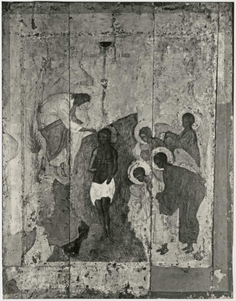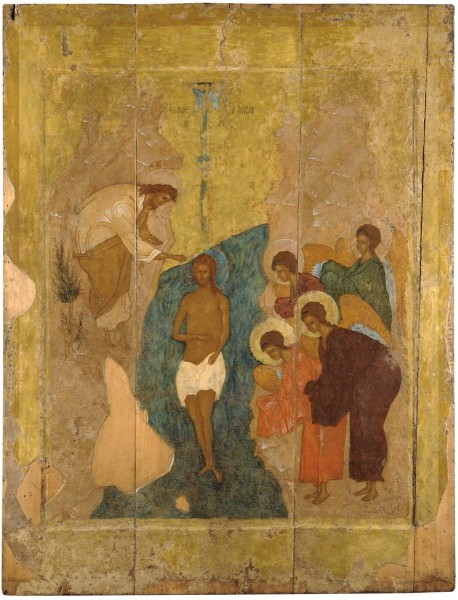 Лаконичное композиционное решение памятника из Твери восходит к аналогичной иконе из Благовещенского собора Московского Кремля (первая половина XV века). Изображению склоняющегося над Иисусом Христом Иоанна Крестителя (слева) и группе из четырех ангелов с покровенными руками (справа) вторят две горки, расположенные по сторонам композиции. Колористический строй иконы, характеризующийся использованием приглушенных тонов, придает композиции особую гармонию и умиротворенность. Надежда Пивоварова // Иисус Христос. СПб, 2000. С. 106.