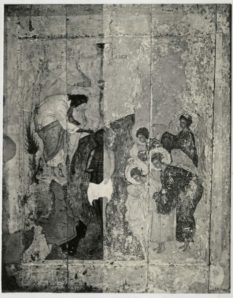 При реставрации 1974 – 1976 годов проведено сложное укрепление красочного слоя и грунта. По всей поверхности иконы наблюдалось шелушение красочного слоя и расслоение левкаса, что связано с пропиткой иконы при поновлении горячей олифой. Красочный слой укреплялся яично-желтковой водной эмульсией с последующим приглаживанием фторопластовым шпателем. Грунт укреплен осетровым клеем с небольшой добавкой меда. При полном раскрытии памятника с личного письма и фигуры Христа были удалены два слоя записи; поля освобождены от слоя записи и перегрунтовки; удалены все остатки записей, олифы и загрязнений на участке, раскрытом в 1937 году. Раскрытие производилось скальпелем и пемзовым карандашом с использованием туго отжатых компрессов с растворителем (компрессы туго отжимались для того, чтобы растворитель не проникал в грунт, который при одном из поновлений был пропитан горячей олифой). Поновительские крупнозернистые вставки темно-серого цвета с ремесленной записью на них выбраны до доски. Мелкие утраты грунта замастикованы, края крупных утрат укреплены реставрационной обмазкой. Тонировки выполнены акварелью, после чего поверхность иконы притерта мастичным лаком в смеси со скипидаром.