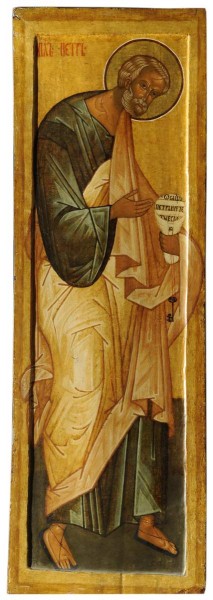 Изображается с ключами от рая, стражем которого является, с седыми недлинными волосами и бородой, в жёлто-синем облачении.