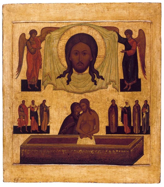 Особенностью данной композиции является введение фигур святых – небесных патронов заказчиков произведения – на поле средника. Этим еще более усиливается литургический смысл иконы и подчеркивается ее назначение как поминальной, на что намекает и необычно вытянутая форма большого гроба. Особое значение имеет на иконе образ Богоматери. В отличие от композиции ДРЖ-1016, Богоматерь не предстоит мертвому телу Христа, как в сценах "Распятия", а обнимает его, как на иконах "Положение во гроб". Однако образ соотносится не только со словами канона Симеона Логофета "О распятии Господа и плаче Богородицы" (см. ДРЖ-2083), но и со службой Святой Недели, когда преобладает тема брака Бога с человечеством. В древности иконы с таким изображением выносили во время торжественных процессий в сопровождении тропаря "Вот жених приходит в полночь" и каждый верующий подходил для их целования. Богоматерь, как олицетворение Церкви, обнимая Сына и сливаясь с ним, идентифицируется с его жертвой. Это образ крестной любви Христа и Церкви, когда жених приходит омыть невесту в своей крови и приготовить для нее свадебный пир Агнца. Поэтому образ гроба становится и символом брачного ложа Царя и Царицы и символом трапезы, на которую сзываются все верные. Вечными соучастниками евхаристической трапезы с Богом становятся и расположенные над гробом святые – небесные патроны заказчиков, постоянно молящие Господа о душах опекаемых ими людей. Ирина Шалина // «Пречистому образу Твоему поклоняемся...». Образ Богоматери в произведениях из собрания Русского музея. СПб. 1995. С. 111.