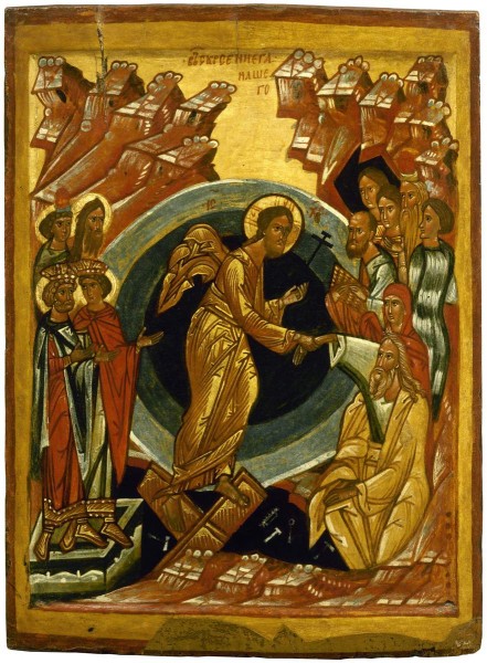 Источниками иконографии служили апокрифическое Евангелие Никодима, богослужебные тексты, псалмы и пророчества Ветхого Завета, Послания апостола Петра, святоотеческие сочинения. Среди последних особенно важны „Слова о сошествии Иисуса Христа во ад“ Епифания Кипрского и Евсевия Александрийского. В них рассказывается о том, как Христос после Своей смерти сошел в преисподнюю, поверг Сатану, ценой жизни спас праведников, смыв Своей кровью первородный грех Адама и Евы. О сошествии Христа во ад поется в Акафистах Христу и Богоматери. Иисус Христос. СПб, 2000. С. 327.