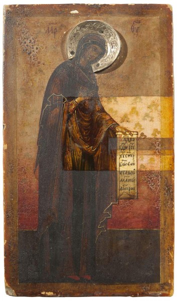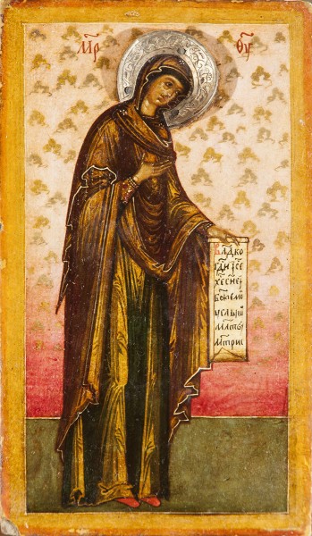 Икона, наряду с иконами Спас Нерукотворный (ДРЖ-295), Иоанн Предтеча (ДРЖ-2237) и Архангел Гавриил (ДРЖ-2239), входит в состав шестифигурного миниатюрного деисусного чина. Его вложил в Александро-Свирский монастырь, согласно надписи на тыльной стороне центральной иконы с изображением Спаса Нерукотворного, торговый человек, житель Никольского погоста на реке Ояти Иван Иванович Долгов.