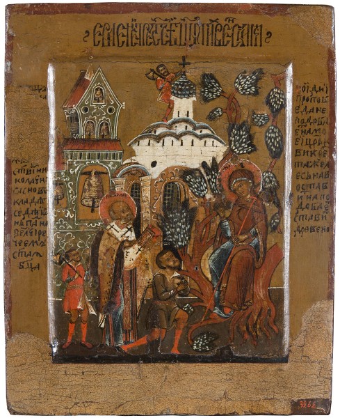 Основу композиции икон с этим сюжетом обычно составляет большое цветущее дерево, под склоненными ветвями которого, как под сенью, помещены изображения сидящей на стволе Богоматери и стоящего Николы. У их ног – Юрыш, который «в страхе и ужасе паде на землю». В «Сказании» подробно рассказывается о нарушении жителями Тихвина требования Богоматери, воздвижении ими железного креста и наказании провинившихся. Эта легенда должна была быть особенно популярной в среде плотников, в защиту которых выступают их покровитель Никола и Богородица. Тогда становится понятным и появление жизнеутверждающего образа дерева, зримо доказывающего победу освященного вековой традицией материала. Подробнее об иконографии см. ДРЖ-2977, Явление Богоматери и Николы пономарю Юрышу, XVII в. Ирина Шалина // «Пречистому образу Твоему поклоняемся...». Образ Богоматери в произведениях из собрания Русского музея. СПб. 1995. С. 227.