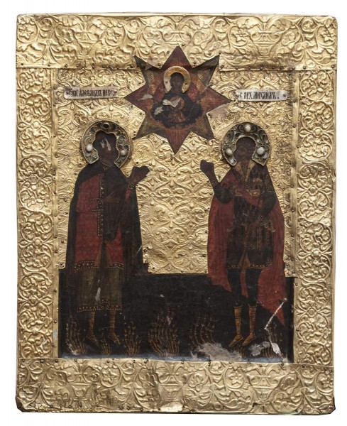 Главная Онлайн ресурсыКоллекцияДревнерусская живопись Князья Александр Невский и Михаил Тверской (?) Князья Александр Невский и Михаил Тверской (?) В окладе. XVII век Дерево, левкас, серебро, перламутр, бархат, темпера, позолота, штамповка, филигрань. 30,8 х 24,6 х 2,0 ДРЖ-2564 Пост. в 1930 из Византийского отделения Государственного Эрмитажа Период XVII век КатегорияБиблейский сюжет Ключевые слова Древняя Русь | святые | Александр Невский, святой благоверный великий князь | Святые земли русской Поделиться «Виртуальный Русский музей» в социальных сетях: