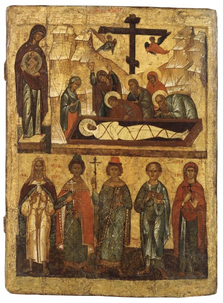 У гробного ложа не присутствует Богоматерь, хотя в подобных сценах она изображалась горестно прильнувшей к лику своего сына. Но она представлена рядом и отдельно, в левой части верхнего регистра иконы, смотрящей на жертвенное тело Христа. Изображение Богоматери в рост, держащей обеими руками перед грудью круглый медальон с изображением младенца Христа на фоне сияния-славы, восходит к древним почитаемым византийским образам, носившим эпитеты "Никопея", "Кириотисса" и "Неопалимая Купина". Эти образы прославляли Богоматерь как вместилище Бога, "телесный храм" Божественной Премудрости. Жест благословляющего двумя руками Христа ассоциируется с его Вознесением. Таким образом, программная композиция верхнего регистра иконы представляет главные вехи осуществления Божественного промысла – от его замышления до жертвоприношения Сына Божия за грехи человеческие и основания Храма истинной веры.