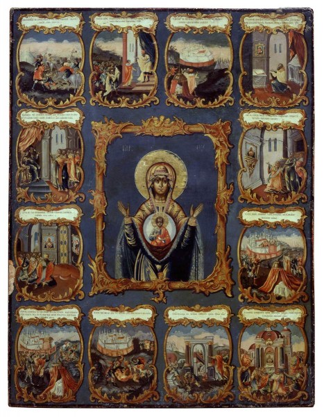 В отличие от древних икон на этот сюжет (кат. 133), где все действие разворачивается в трех регистрах, на иконе XVIII в. изображение разделено на двенадцать отдельных композиций, что позволило проиллюстрировать событие более "многоречиво". Включены эпизоды, предшествовавшие самому чуду (сражение при сборе дани в двинских землях – клеймо 1; снаряжение рати Андреем Боголюбским – в клейме 2), а также более позднего времени – построение в Новгороде церкви в честь иконы (клейма 11 и 12). Достаточно конкретные признаки реальной топографии древнего Новгорода, присутствующие в произведении средневекового мастера, в поздней иконе заменены изображениями фантастического града и шатров осаждающего войска, то есть мотивами, почерпнутыми, как и сами сцены битв, из гравюр с произведений западноевропейских художников XVI–XVII вв. В то же время, в икону введены некоторые мотивы, обусловленные непосредственными наблюдениями. Так, в клейме 9 икона Богоматери на городской стене показана обернувшейся к Новгороду, и на ее тыльной стороне, обращенной к "сопротивным", можно увидеть врезные встречные шпонки, скрепляющие ее доски. В клейме 6 обращает на себя внимание изображение резного позолоченного кронштейна, поддерживающего икону Богоматери; подобную деталь убранства легко себе представить в дворцовом интерьере середины XVIII столетия.
