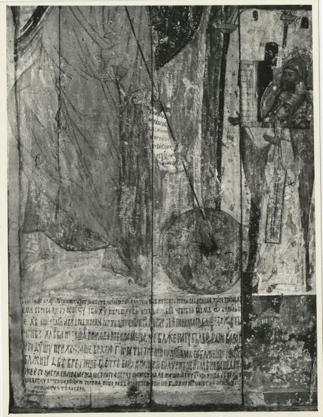 Вся поверхность находилась под толстым слоем грязи и птичьего помета. Тонкий грунт иконы сильно разрушен. Имелись многочисленные вздутия левкаса по всей поверхности, в нижней части иконы – полное отставание грунта и паволоки от доски. В местах утрат просматривались позднейшие записи.