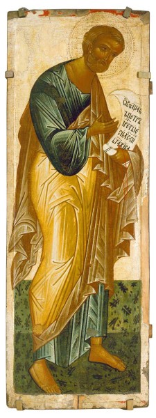 Апостол Пётр (Симон, сын Ионин, 1 до н. э. - около 67, Рим). Один из двенадцати апостолов (ближайших учеников) Иисуса Христа. Вместе с апостолом Павлом называется «первоверховным апостолом». Святой Православной и Католической церквей. В Католической церкви — первый папа римский. Изображается с ключами от рая, стражем которого является, с седыми недлинными волосами и бородой, в жёлто-синем облачении.