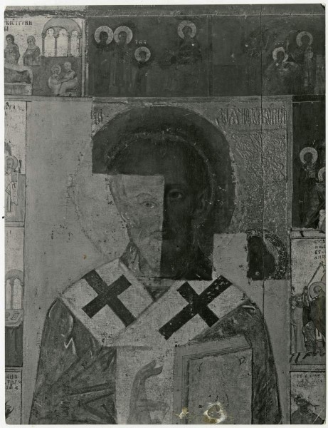 Удалены два слоя сплошных и несколько частичных записей с прослойками олифы, а также перелевкашенный орнаментальный рельефный фон XVIII века. Рельефный орнамент на фоне средника в его верхних слоях удалялся с помощью бормашины. Красочный слой иконы тонкий, и поэтому особое внимание обращалось на зеленые и желтые, которые “имеют характер почти лессировочных покрытий” (см. “Реставрационный протокол Н. В. Перцева”. Отдел реставрации древнерусской живописи ГРМ). Свинцовые белила погасли, люминесцируют под действием ультрафиолетового облучения. Попытка восстановить белила с помощью H2O2 не дала положительного результата. В нижней части нижнего ряда клейм сохранена чинка грунта с записью (возможно, XVII – XVIII века). Тонировки выполнены акварелью на старой олифе. Икона притерта мастичным лаком.