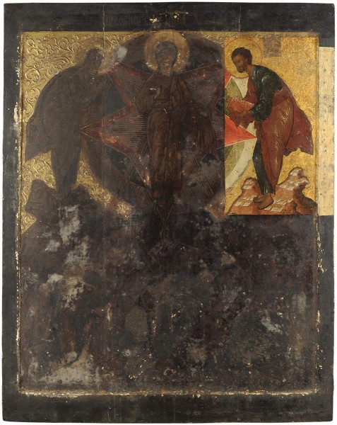 Авторская живопись иконы находилась под сплошной поздней записью и частичными прописками. Золотой фон дважды поновлялся: вначале был перезолочен по подгрунтовке, позднее – перекрыт рельефным орнаментом. Имелся слой сильно потемневшей, неравномерной по толщине олифы.