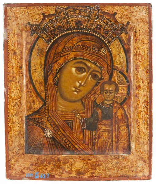 Первоначальная чудотворная икона, повторенная потом в тысячах списков, была обретена в Казани в 1579 г., вскоре после завоевания ее войсками Ивана Грозного. Чудотворный образ открыла в пепле пожарища, по велению явившейся ей во сне Богоматери, девятилетняя отроковица Матрона со своей матерью. Вскоре от иконы последовали чудесные исцеления; на месте обретения иконы был основан женский монастырь. День обретения образа — 8 июля — стал днем празднования «Казанскому» образу Богоматери. Второй день празднования был установлен при царе Алексее Михайловиче, в память сражений за Китай-город 22 октября 1612 г. Благодаря заступничеству «Казанской» иконы войскам Дмитрия Пожарского и москвичам удалось одержать решительную победу над польскими отрядами, засевшими в Кремле, что предрешило их сдачу и полное освобождение Москвы. Ирина Сосновцева // «Пречистому образу Твоему поклоняемся...». Образ Богоматери в произведениях из собрания Русского музея. СПб. 1995. С. 233.