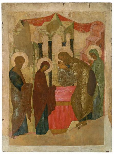 До наших дней сохранилось мало произведений, которые бы достоверно принадлежали кисти Андрея Рублева. Среди них – фресковые росписи древнего Успенского собора во Владимире, к исполнению которых Андрей Рублев и Даниил Черный приступили в 1408 году. По-видимому, одновременно был воздвигнут и новый иконостас, первоначально включавший в себя четыре ряда: местный, деисусный, праздничный и пророческий. Часть образов, входивших в этот грандиозный иконописный ансамбль, дошла до наших дней; ныне эти иконы хранятся в Русском музее и Третьяковской галерее. Из двух праздничных икон Русского музея более близка творчеству Андрея Рублева икона „Сретение“. Тонкий лиризм и одухотворенность образов, спокойная гармония всех элементов композиции, преобладание нежных сочетаний разных оттенков цвета и золота в колорите, огромное значение силуэта, линии для характеристики внутреннего мира персонажей – все это черты московской иконописи начала XV века, которые с наибольшей полнотой выразились в произведениях иконописца-инока Андрея Рублева. Ирина Сосновцева // Иисус Христос. СПб, 2000. С. 83.