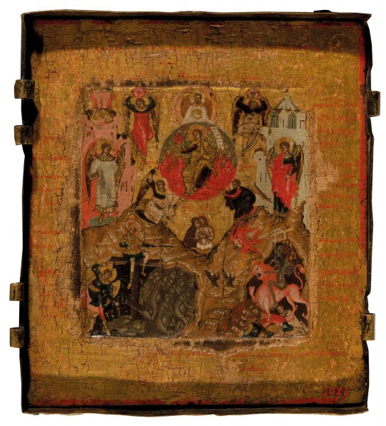 Публикуемые иконы (ДРЖ-239, ДРЖ-240), являющиеся створками не дошедшего до наших дней складня, — один из ярких образцов художественного направления, получившего в литературе наименование «строгановской школы иконописи». Мелочное, доведенное до каллиграфии письмо, изящные пропорции фигур, изысканная колористическая гамма, сочетающиеся с усложненным иконографическим замыслом, — характерные черты искусства, развивавшегося под покровительством именитых людей Строгановых.