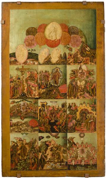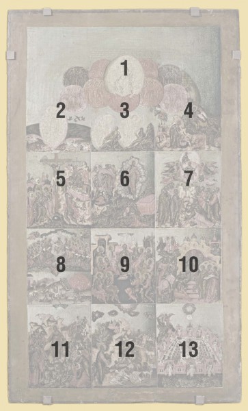 The Symbol of Faith is a short prayer on the essence of Christianity. The first symbol of faith was given by Jesus Christ himself when he said these words, which were then repeated by his apostles before the Ascention: “Therefore go and make disciples of all nations, baptizing them in the name of the Father and of the Son and of the Holy Spirit, and teaching them to obey everything I have commanded you. And surely I am with you always, to the very end of the age.” (Matthew 28: 19-20; Mark 16: 15). The Symbol of Faith was established and promulgated during the first Council of Nicaea in 325 and was amended during the Second Ecumenical Council in Constantinople. The icon consists of twelve parts, on which the words of the prayer were successively painted. The Old Russian icon paintings and frescoes, illustrating the “Symbol of Faith”, are known since the 16th century. Engraved sheets with such illustrations were widespread in the 17th century. Many scenes or different parts of them were copied by icon painters from engraved sheets of the Piscator Bible, which was popular at that time and imported from Western Europe.