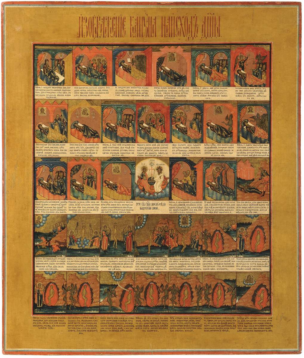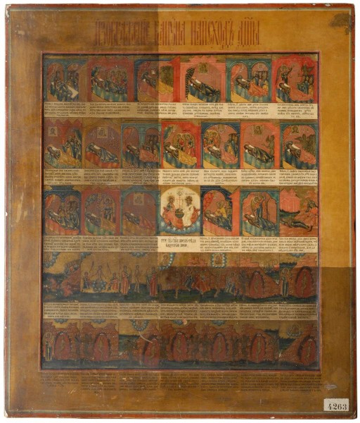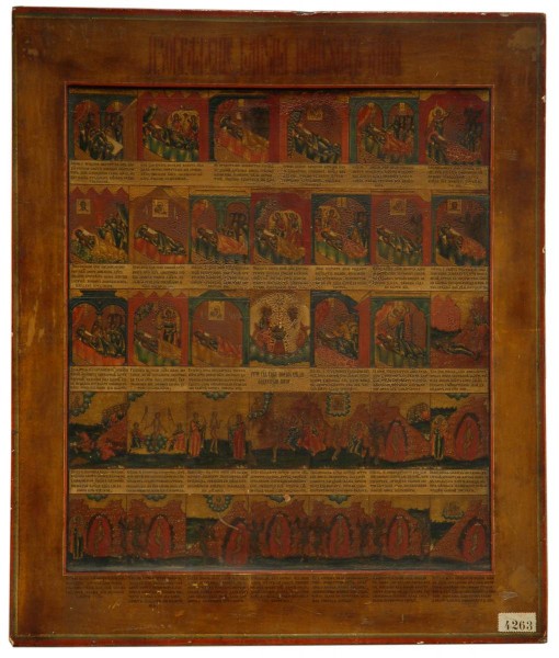Реставрационные работы по раскрытию проводились поэтапно. Первоначально был определен участок пробного раскрытия в правой верхней части иконы на поле, частично в 6–м клейме, на котором определена методика раскрытия для миниатюрной живописи. Далее работы проводились планомерно по всей поверхности иконы. Лаковая пленка утоньшалась под микроскопом с применением медицинской желчи до выявления границ утрат лака. После их фиксации производилась довыборка загрязнений с поверхности красочного слоя. После завершения работ по раскрытию иконы в места утрат левкаса подведен реставрационный грунт, места утрат красочного слоя тонированы акварелью. Икона покрыта реставрационным лаком. После реставрации  икона приобрела цельный экспозиционный вид.