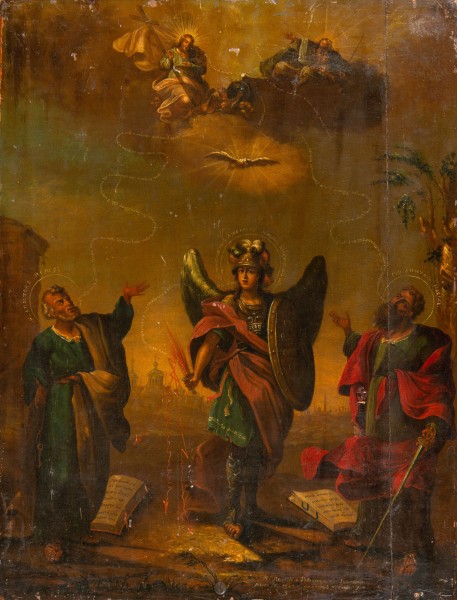 На переднем плане иконы на фоне городского пейзажа изображены архистратиг Михаил и апостолы Петр и Павел. Михаил в воинском облачении и с крыльями за спиной; держит в правой руке факел с искрящимися молниями, в левой — щит. Апостолы представлены в барочных, развевающихся одеждах, под их ногами — раскрытые евангелия. Петр держит в правой руке ключ (от врат рая), Павел — обнаженный меч. Молитвы в виде тонких ленточек поднимаются из их уст к престолу Св. Троицы, изображенной на небесах.