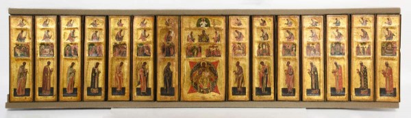 Праздничный ряд (слева направо): Явление ангела женам-мироносицам; Рождество Богоматери; Благовещение; Введение во храм; Рождество Христово; Сретение; Крещение; Сошествие во ад; Распятие (два последних — на центральной створке, над „Спасом в силах“); Троица Ветхозаветная; Преображение; Воскрешение Лазаря; Вход в Иерусалим; Воздвижение креста; Вознесение; Успение Богоматери.