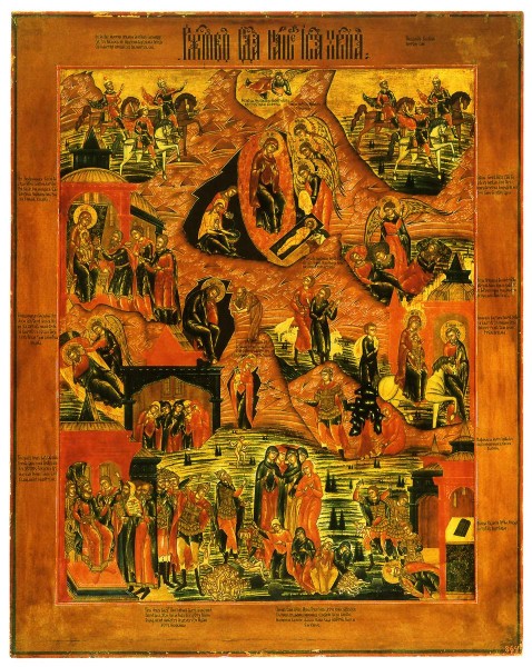 Сцена рождества в Вифлеемской пещере дополнена историей о путешествии и поклонении волхвов, проиллюстрированной в четырех эпизодах в верхней части. В нижней — рассказ о бегстве в Египет и избиении Вифлеемских младенцев. Повествование о злодеянии Иродовом заполняет всю нижнюю треть композиции, разворачиваясь на фоне унылого пейзажа, напоминающего суровую северную природу. Мотивы бегства в чужие земли под угрозой расправы и насилия, типичные для такой иконографии, были созвучны настроениям старообрядцев, испытывавших на себе постоянные притеснения властей.
