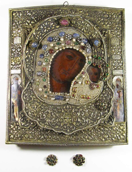 - Дерево, левкас, серебро, золото, изумруды, сапфиры, рубины, аметисты, жемчуг, камни уральские, слюда, ткань, темпера, позолота, чеканка, гравировка, шитьё. 28,8 х 25,0 х 2,9