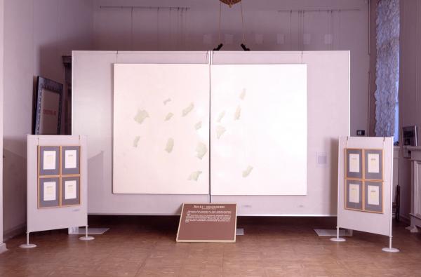 - Оргалит, эмаль. Диптих: 260 х 290 (каждая часть). Доска-объяснение: 117 х 105. 24 текста в рамках: Ок. 51 х 34,9 (каждый)