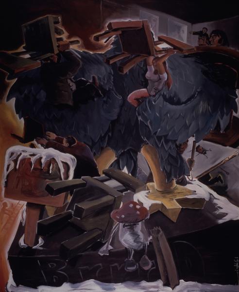 Две фигуры яростно бросаются друг на друга, держа в руках ставшие орудием стулья, однако их удерживает и разнимает орел. Ядовитая атмосфера дополнительно подчеркнута красным мухомором, стоящим у переднего края.