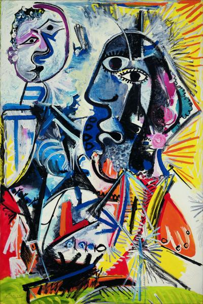 "Живопись сильнее, чем я. Она вынуждает меня делать то, что хочет она" (Пикассо). Меньшую, почти круглую голову на светлом фоне, которая показана одновременно и анфас и в профиль, можно рассматривать как детскую. Вытянутая правая и поднятая левая рука ребенка напоминают позу стрелка из лука, что позволяет трактовать фигуру как Амура. Гораздо большего размера овальную голову, в изображении которой также использован принцип множественности точек зрения, исследователи сочли мужской на основании угловатости фрагментов лица. Абрис этой фигуры кажется очерченным красным цветом, справа на уровне плеча можно различить руку. Вытянутое желтое цветовое пятно рядом, перечеркнутое световыми линиями, можно счесть мечом, таким образом, фигура окажется экипированной по-военному. Амур и Воин - это символы любви и борьбы, первичные силы и движущие пружины жизни, которые Пикассо постоянно изображал во все новых и новых образах.