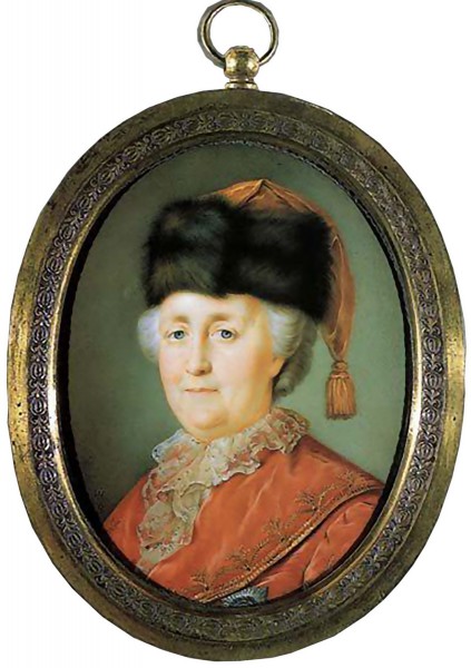 написать государыню пожилой женщиной с выбивающимися из-под шапки прядями седых волос. Удивляет и то, что Екатерина, придирчиво относившаяся к своим изображениям, заказывала с него копии. По заказу императрицы придворный художник-миниатюрист Петр Жарков писал с него на эмали погрудные копии для подарков.
