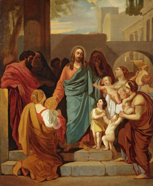 Композиция на евангельский сюжет (Мф. 19:13–15). Копии, выполненные неизвестными художниками, находятся в ГРМ и ГМИ Узбекистана. Возможно, одна из них была сделана М. И. Железновым. К проповедовавшему Иисусу женщины привели детей и принесли младенцев, чтобы Он благословил их и помолился за них. Но ученики стали препятствовать этому, опасаясь шума и толпы. И тогда Иисус сказал: «пустите детей и не препятствуйте им приходить ко Мне, ибо таковых есть Царство Небесное. И возложив на них руки, пошел оттуда». Иллюстрируя евангельский текст и следуя композиционным принципам классицизма, художник изображает в центре Христа, который касается руками младенцев, принесенных обступившими Его женщинами. На втором плане в тени — Его ученики, пребывающие в некотором недоумении. Фоном служат архитектурные строения, отделяя ближний план от дальнего, хотя по Евангелию действие происходило вне городов, на пути из Галилеи в пределы Иудейские. Эскиз принадлежал одному из учеников мастера — М. И. Железнову, а затем попал в московскую коллекцию И. Е. Цветкова. С. С. Степанова // Великий Карл. К 225-летию со дня рождения К. П. Брюллова. СПб, 2024. С. 317.