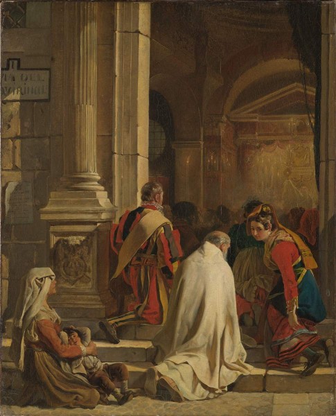 Общество поощрения художников всячески старалось предостеречь Брюллова от увлечения жанровой живописью, направляя его к сюжетам евангельским и из античной мифологии. Однако молодой художник начал свое пребывание в Италии именно с работ в бытовом жанре — самом низшем в академической иерархии. Интерес к жанру легко объясним — новизна окружающего моментально заставила забыть все напутствия и предостережения. Брюллов был любопытен к жизни, и жизнь, так не походившая на прежнюю, не могла не захватить его. Все было другим: свет и воздух, город, жизненный ритм его улиц, люди, по-иному говорившие и одетые. Плащи капуцинов, длинные посохи пилигримов, пронзительные дудочки и волынки пифферари — важные акценты в чужой толпе. И, вероятно, яснее всего национальные, бытовые, культурные различия могли явиться художнику именно в различии религиозном. На ступенях церкви изображена коленопреклоненная группа: старик в белом плаще, женщина с ребенком, молодая итальянка с лукавым взглядом и мужчина в красочной полосатой форме швейцарской гвардии — охраны папы римского и Ватикана. На стене прикреплена табличка с адресом: «Via Kvirinal 1», которая может указывать только на церковь Сант Андреа аль Квиринале, барочную постройку работы знаменитого Бернини. Церковь посвящена святым Андрею Первозванному и Франциску Ксаверию, одному из основателей Ордена иезуитов. Бернини считал Сант Андреа аль Квиринале одним из лучших своих творений, а его сын Доменико вспоминал, как отец часами сидел внутри церкви, наслаждаясь выполненной работой. Владельцем картины был хороший знакомый Брюллова — П. К. Ферзен, обер-егермейстер, начальник Императорской охоты при Александре II. Н. Г. Преснова // Великий Карл. К 225-летию со дня рождения К. П. Брюллова. СПб, 2024. С. 320.
