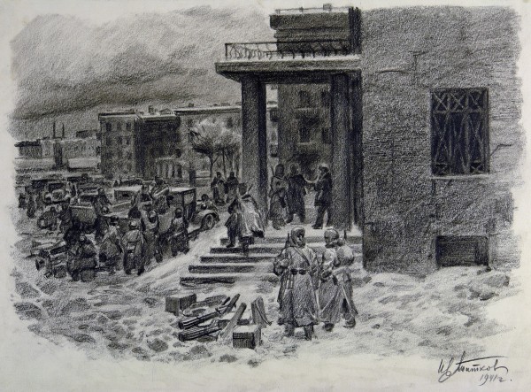 На обороте карандашом: (Окраина Москвы) / На обороне Москвы / Зима 1941 года / Сибиряки приехали / на оборону Москвы / (Nская сиб. арт. часть). 1941