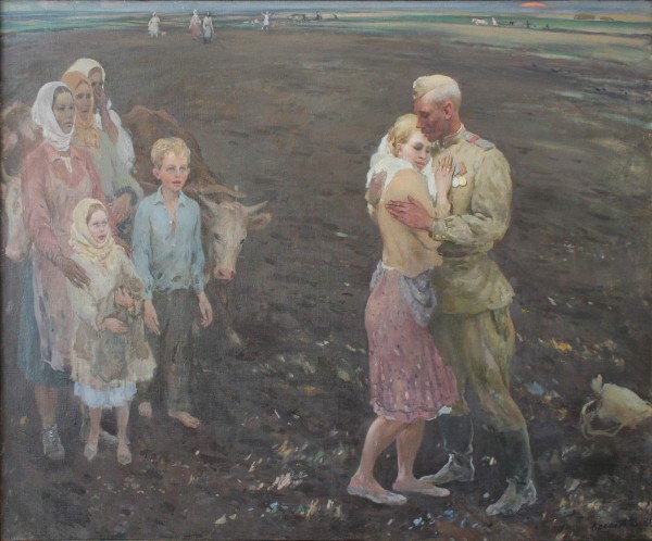 Возвращение фронтовика. Типажи персонажей подчеркнуто деревенские, русские; светлоглазые и светловолосые. На объятие вернувшегося с войны солдата с женой смотрят с разной степенью выражения чувств группа женщин и детей. Особенно яркие эмоции читаются на лице босоногого мальчика с широко открытыми глазами. Действие происходит прямо в поле во время весенней пахоты. За спинами женщин запряженные в плуг коровы. В имени Иван можно увидеть и имя конкретного человека, и обобщенный образ русского солдата. Картина «Возвращение Ивана» до поступления в Магнитогорскую картинную галерею репродуцировалась на почтовой марке СССР.