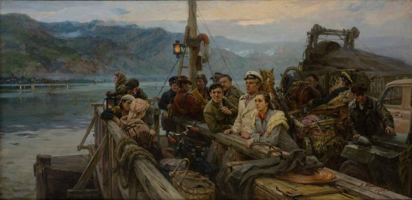Эта работа хранится в музее Академии художеств, другой вариант, 1954 года, с некоторыми изменениями – в Самарском областном художественном музее. Картины в целом одинаковы по композиции, сходны по сюжету – действие происходит на плавшкоуте, так называемом «самолете», предназначенном для переправы людей, конных повозок и машин через Енисей. Здесь оказались люди из разных социальных и возрастных групп: юные, простенько одетые девушки, рабочий люд, водители машин, возницы гужевого транспорта, горожанка с красиво уложенными волосами, широкоплечий мужчина в форме гражданского ведомства…