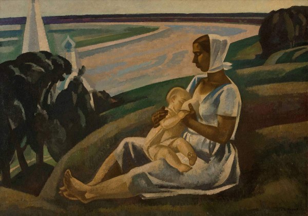 Виктор Иванов – художник, у которого нет бытового жанрового пейзажа. Вот и в этом, исполненном в монументальных формах эпическом холсте, «На Оке» (1972) каждый элемент композиции ощущается частью огромного мироздания и невольно погружает в раздумья о вечных ценностях. В сильном, цельном образе крестьянской женщины в белоснежном платке, прижимающей к груди ребенка, выражена сила материнства, в котором художник видит основу жизни. Его Мадонна неотделима от бескрайних русских просторов – складок волнистых холмов, извилистой реки, взметнувшегося к небу храма, который словно горящая свеча вырастает над шапками крон. Этот объект в поздних авторских вариантах, хранящихся в ГТГ, ГРМ и Рязанском областном музее, отсутствует в композиции. В первоначальном же варианте картины, обладателем которого является Смоленский музей, храм занимает важное место, придавая замыслу еще большую глубину и значительность.