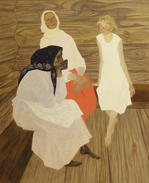 На картине – три женщины, сидящие в избе, связанные узами родства. Внимание зрителя захватывает не событие, а пространство их чувств, их памяти. В картине заложено множество содержательных линий. Но главная из них связана с мотивом памяти о Великой Отечественной войне. Сидящие в избе собрались в День Победы, вспоминая родных, не вернувшихся с войны.
