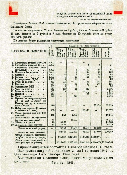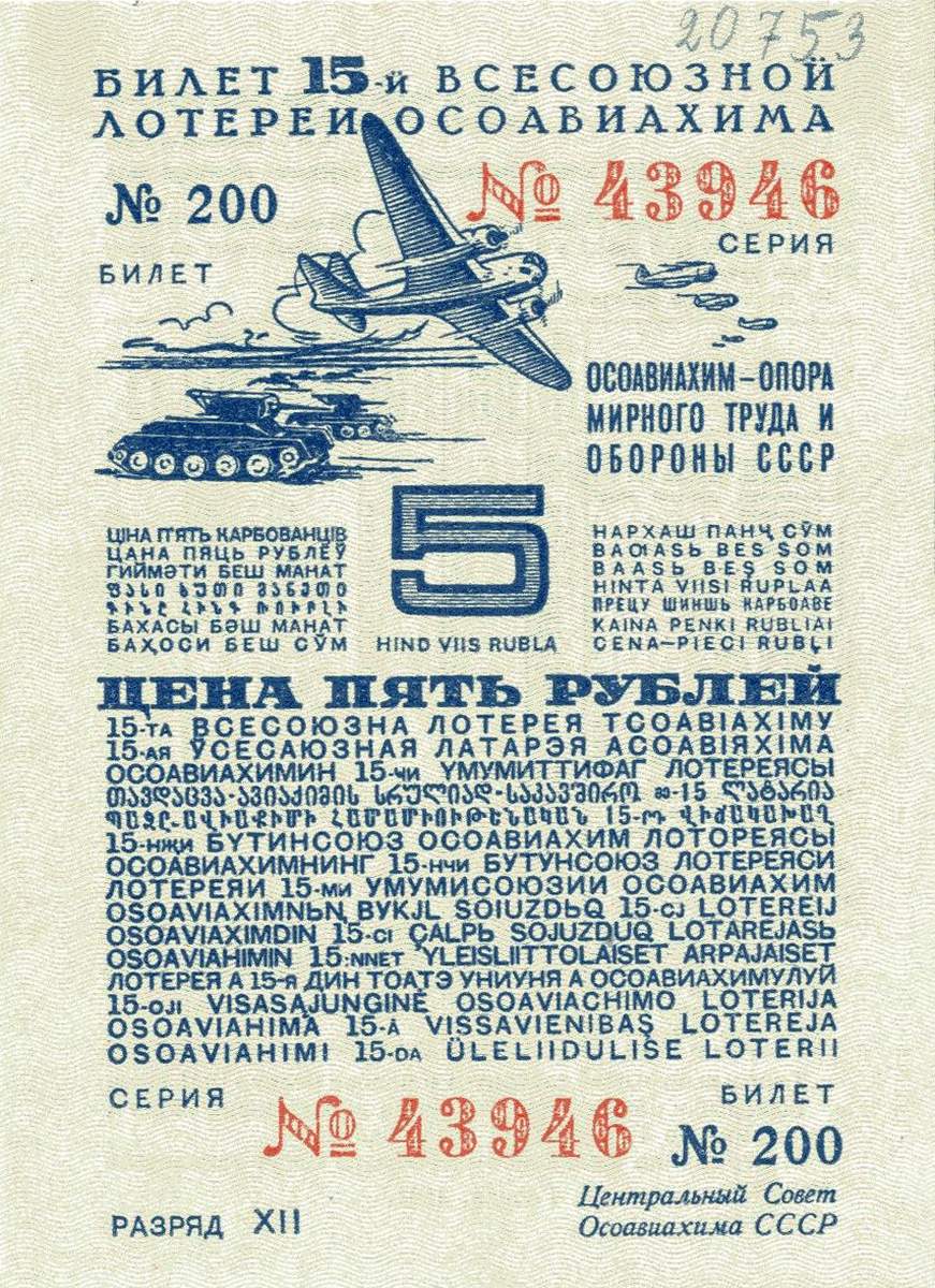 Home page Online resourcesCollectionsNumismatics Билет 15-ой всесоюзной лотереи ОСОАВИАХИМА, на сумму 5 рублей Билет 15-ой всесоюзной лотереи ОСОАВИАХИМА, на сумму 5 рублей 1941 Paper, печать. 7,4 х 10,1 Бум.А-20753 Поступил из собрания Н. Г. Супрунова Period Early 20th century Keywords The Great Patriotic War | 1918-1941 (soviet period) | Soviet Art | Airplanes, parachutes Virtual exhibitions and 3d-tours Помним! К 80-летию полного освобождения Ленинграда от фашистской блокады Share «Виртуальный Русский музей» в социальных сетях:
