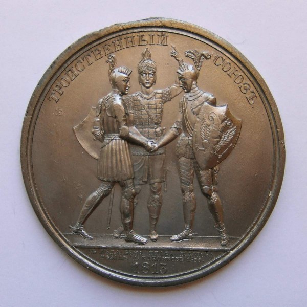 Реверс: Император Российский Александр Первый сопрягшийся уже дланию дружбы с Королём Прусским Вильгельмом третьим, оба приемлют простертую к ним десницу Австрийского Императора Франца первого. Александр в знак правости дела и чистоты намерений своих воздвигает на небо руку. Тако три Венценосца, сильнейших в Европе, внемля гласу Божию во глас народов своих, заключают во имя Святыя Троицы неразрывный, свыше благословляемый тройственный союз.