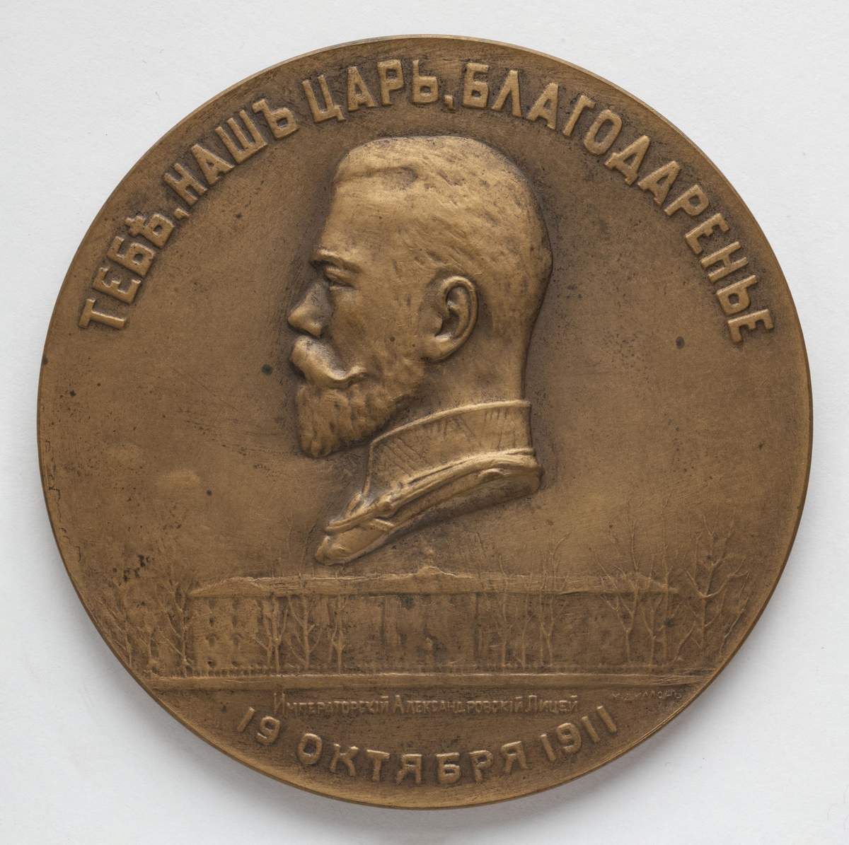 Л.С.: внизу справа: М. ДИЛЛОНЪ; по окружности вверху надпись: ТЕБЕ, НАШЪ ЦАРЬ, БЛАГОДАРЕНЬЕ; внизу: Императорский Александровский лицей 19 ОКТЯБРЯ 1911