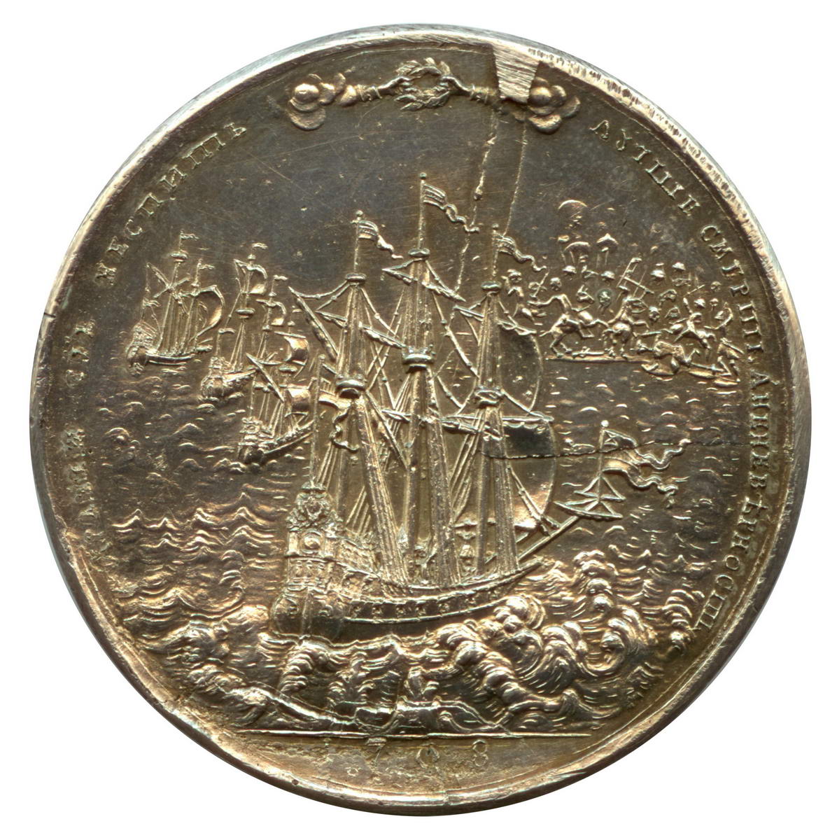 Адмирал Федор Матвеевич Апраксин (1661‒1728) в 1708 г. успешно отразил попытки шведов захватить Санкт-Петербург и нанес им несколько чувствительных поражений, за что был осыпан царскими милостями: был пожалован чином генерал-адмирала, графским титулом. В ознаменование заслуг Апраксина была изготовлена золотая медаль. Впоследствии для меморативных и коллекционных целей медаль неоднократно чеканилась на Санкт-Петербургском Монетном дворе в различных металлах.