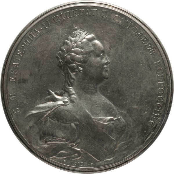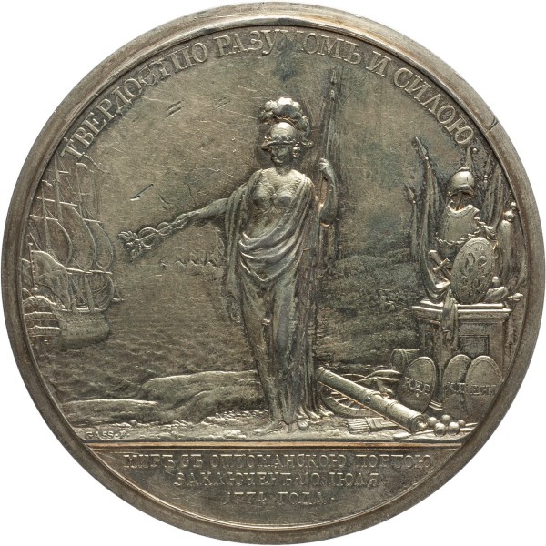 На лицевой стороне портрет Екатерины II в венке, короне, чешуйчатом панцире с орденской лентой. На оборотной стороне ‒ Паллада с копьем в левой руке, кадуцеем в правой указывает на плывущий в море корабль под русским флагом, вдали виднеются еще несколько кораблей. Справа пьедестал с воинскими доспехами, знаменами и щитом с Российским гербом, внизу три щита с буквами «КЕР, КИ, ЕНI» (Керчь, Кинбург, Еникале). На земле пушка, ядра, лафетное колесо и колчан со стрелами, вдали поле битвы. Вверху по кругу «ТВЕРДОСТИЮ РАЗУМОМ И СИЛОЮ». В обрезе «МИР С ОТТОМАНСКОЮ ПОРТОЮ ЗАКЛЮЧЕНЪ. 10 IЮЛЯ. 1774 ГОДА».