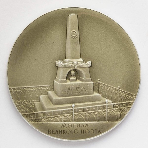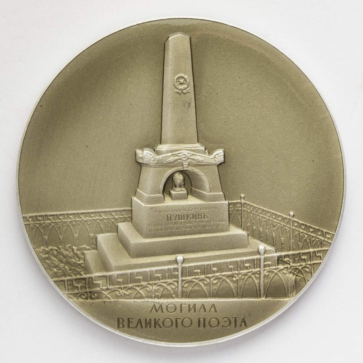 Медаль в честь А. С. Пушкина с изображением могилы поэта