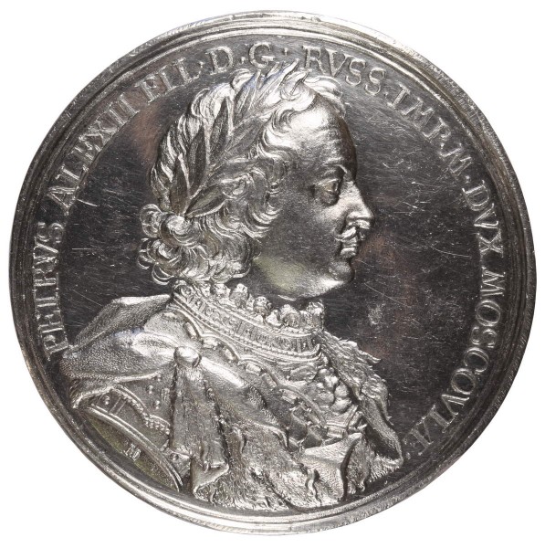 The desire of Peter the Great to make Russia one of the European commonwealths initiated the birth of medallic art, which before this was unknown in the Tsardom of Moscow. The famous Nuremberg medallist Philipp Heinrich Müller was ordered to create a series of 26 medals commemorating events of the Northern War. The medals were produced in 1713‒1714 using the highest quality materials and corresponding to European medallic traditions. Beginning in 1716, these commemorative medals were produced in Moscow for presentational purposes: they were presented as gifts to foreigners and senior officers of the state. The letters highlighted in the Latin legend refer to the date, on which the event took place.