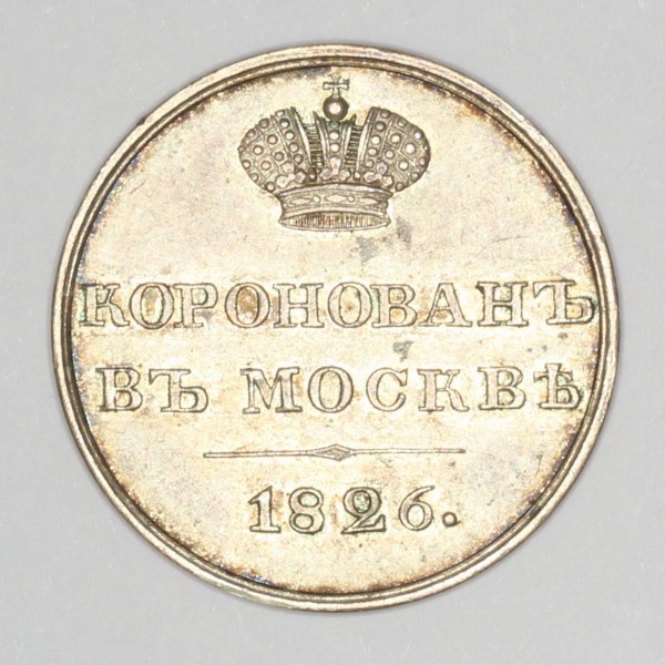 Коронация Николая I состоялась 22 августа 1826 года в Москве. В 10 часов в Успенский собор прошла вдовствующая Императрица Мария Федоровна со свитой, за ними следовал Николай I с Императрицей. Их встречали митрополит новгородский Серафим, киевский митрополит Евгений и московский архиепископ Филарет. Николай до конца обряда оставался в генеральском мундире шефа Преображенского полка. Церемония в основных чертах повторяла традиционную: посещение Архангельского и Благовещенского соборов, возвращение во дворец, краткий отдых, обед за особым императорским столом в Грановитой палате. Присутствующим на коронации раздавались жетоны.