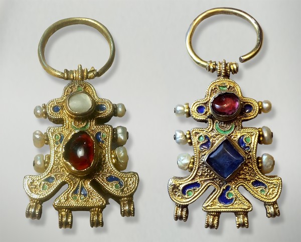 Эти украшения интересны не только своим сканым орнаментом. Они подчеркнуто объемны, декоративны: серьги имеют заметную толщину, обе стороны часто дополнены накладками из камней или цветных стекол в гладких оправах. В литых плоских серьгах с гравировкой или эмалью мотив птицы теряется в завитках орнамента, при этом выделяются объемные цветные камни, помещенные в центре, и подвески по нижнему краю.