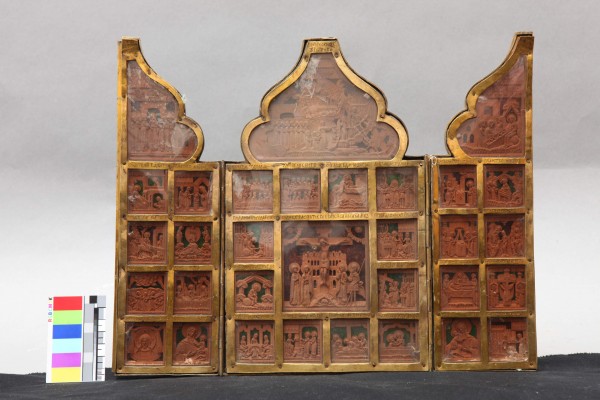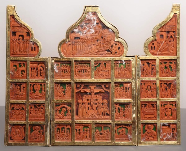 Складень состоит из трех створок в серебряном окладе, позолоченном и с гравированной надписью. Каждая створка изготовлена из отдельной деревянной пластины в виде рамки, в которую вставлены резные клейма. Техника резьбы на клеймах – прорезная. Отверстия резьбы декорированы цветными фонами.